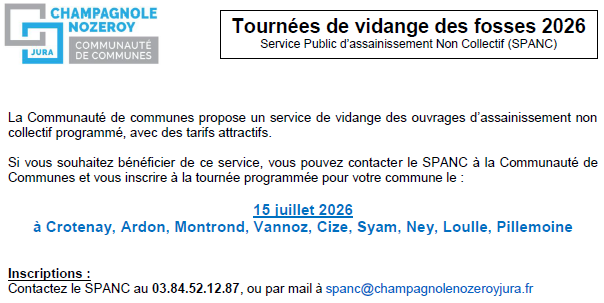 Assainissement Non Collectif et vidanges 2026 Auteur/autrice de la publication :Patrice Anthonioz Publication publiée :22 janvier 2026 Post category:Actualités / Agenda Commentaires de la publication :0 commentaire Courrier d'information PDF avec tarifs Formulaire d'inscription Vous devriez également aimer Didier nous a quittés 26 novembre 2025 Arrêté sécheresse 29/07/2022 1 août 2022 Adieu à Danièle Girardot 21 août 2021 Laisser un commentaire Annuler la réponseCommentEnter your name or username to comment Enter your email address to comment Saisir l’URL de votre site (facultatif) Enregistrer mon nom, mon e-mail et mon site dans le navigateur pour mon prochain commentaire.